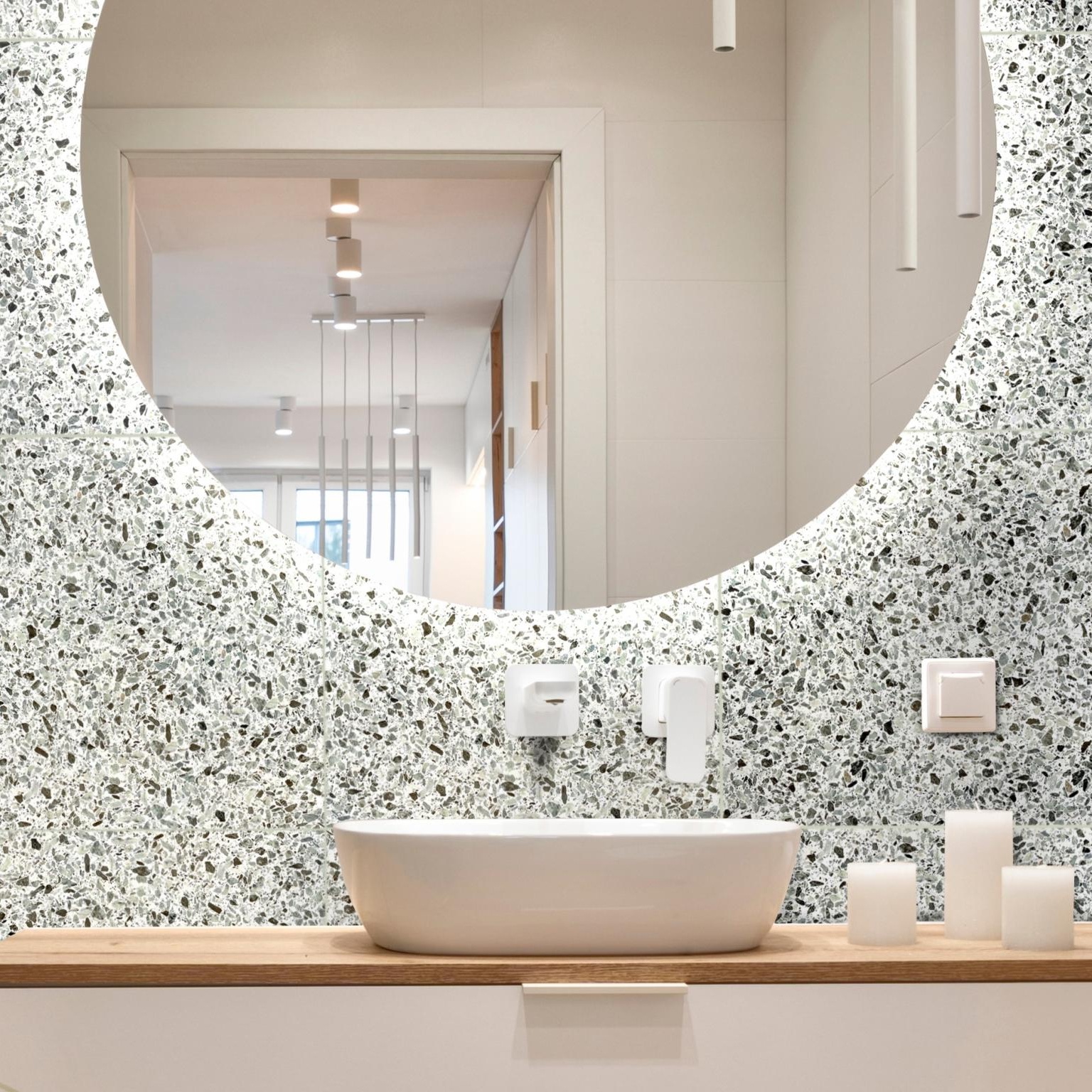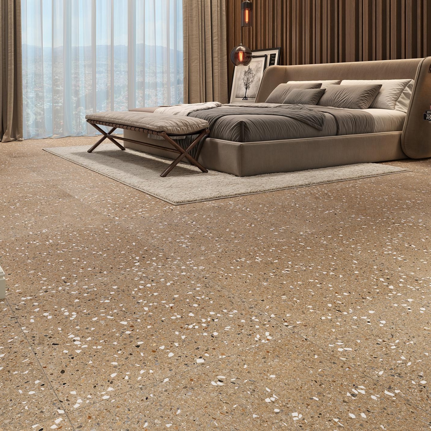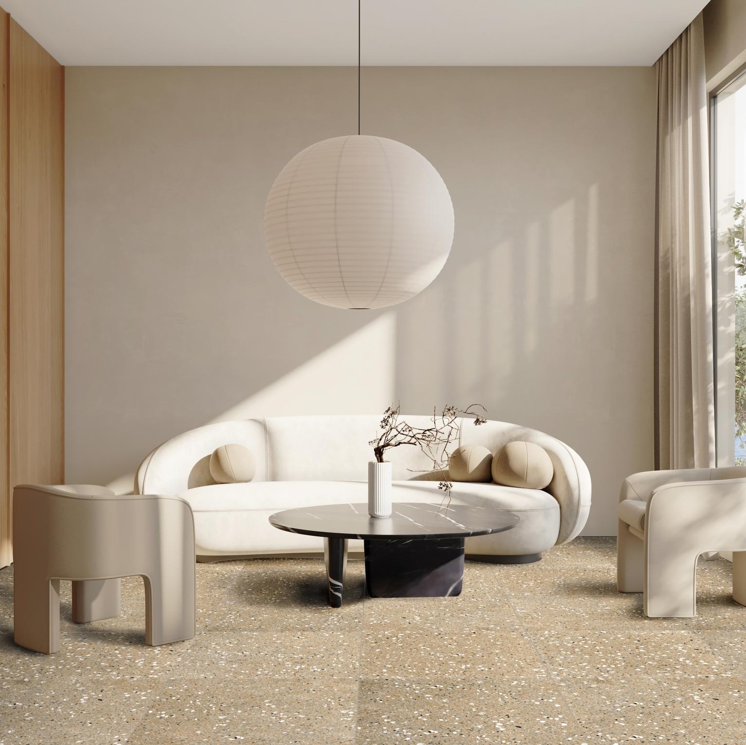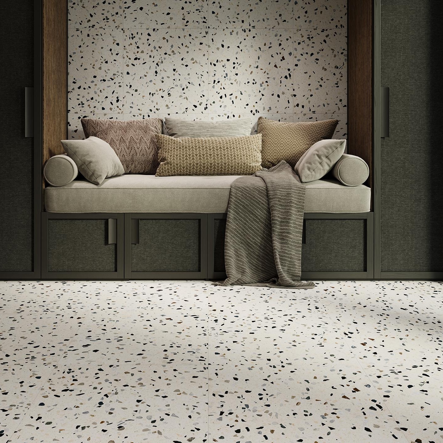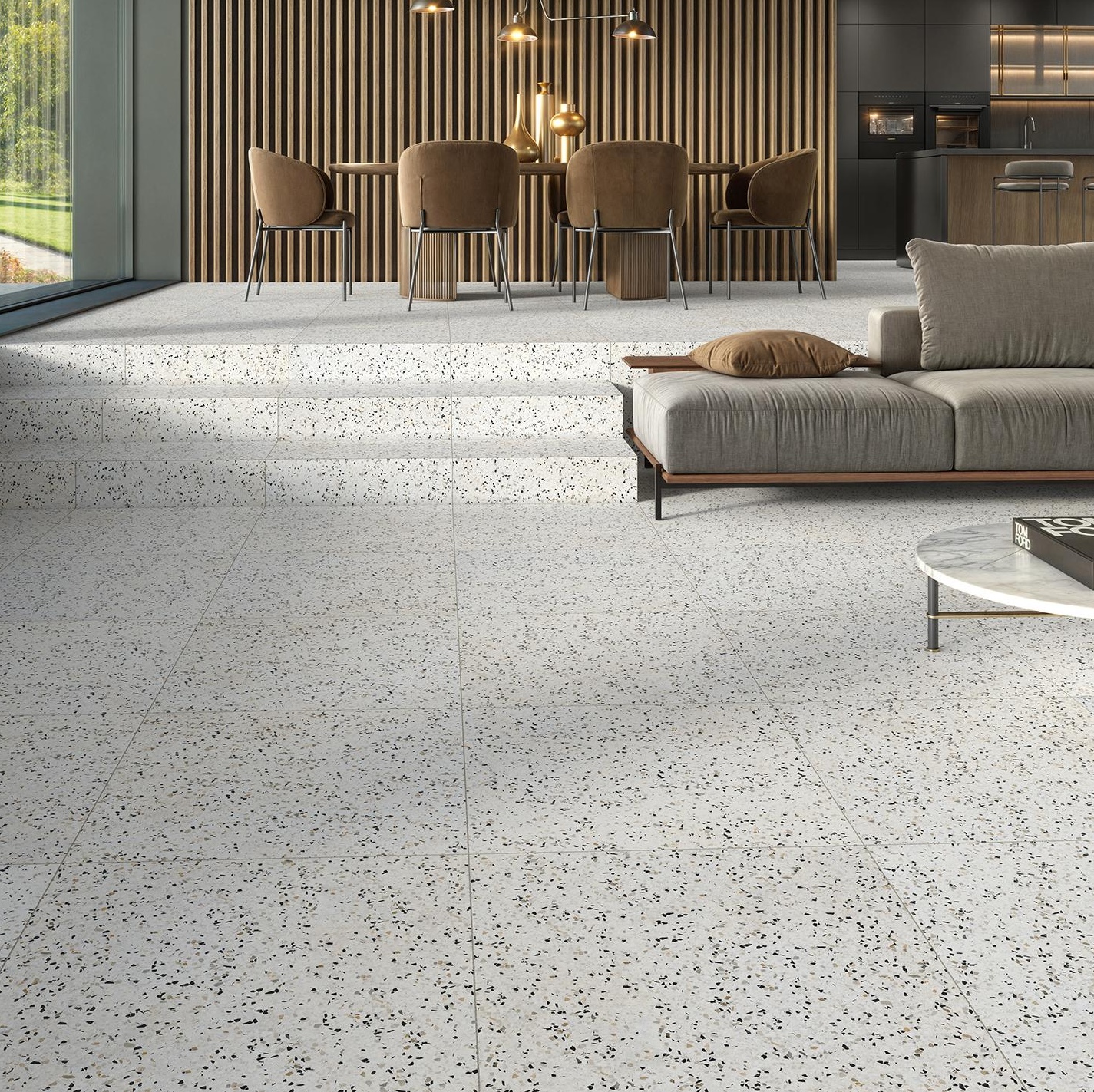 Le carrelage 60×60 cm assure une pose équilibrée et une lecture uniforme des espaces, autant en résidentiel qu’en tertiaire. Ce format facilite les alignements et renforce l’effet matière du terrazzo.