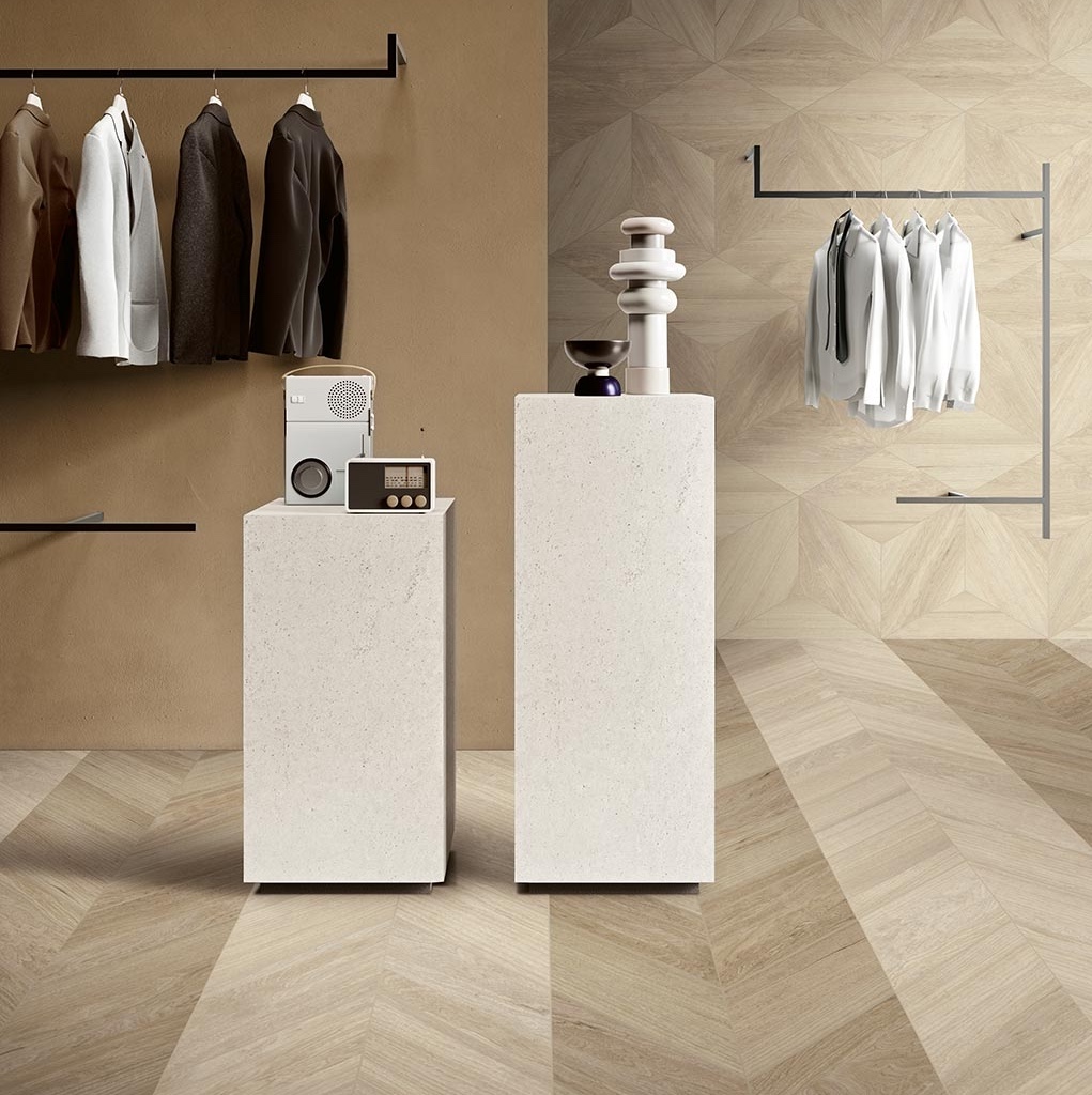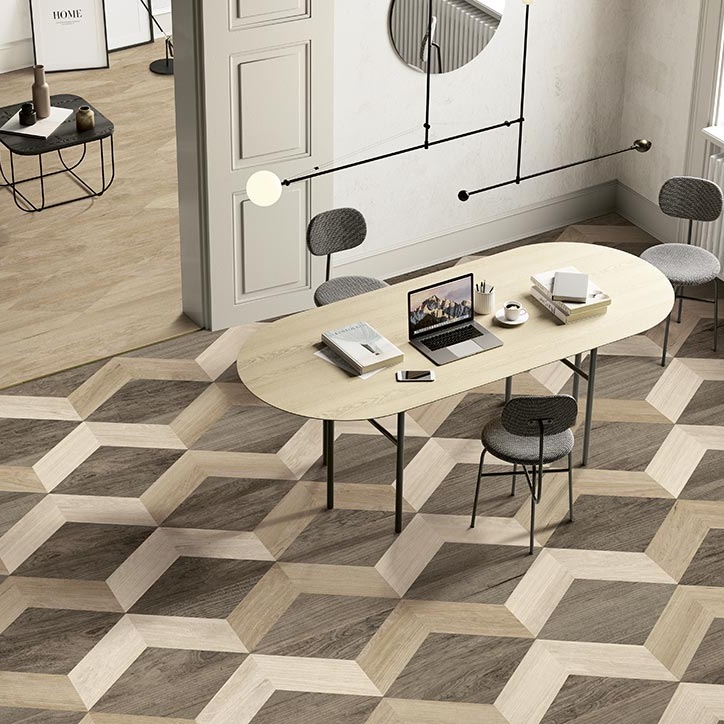 La collection propose deux géométries : le format rombo 42,9×49,5 cm et le format chevron 21,4×49,5 cm, tous deux d’une épaisseur de 9 mm. Les finitions mates naturelles révèlent la texture du bois avec réalisme, tandis que les décors Cementine déclinés en 9 motifs aléatoires permettent de composer des tapis graphiques ou des bordures élégantes.