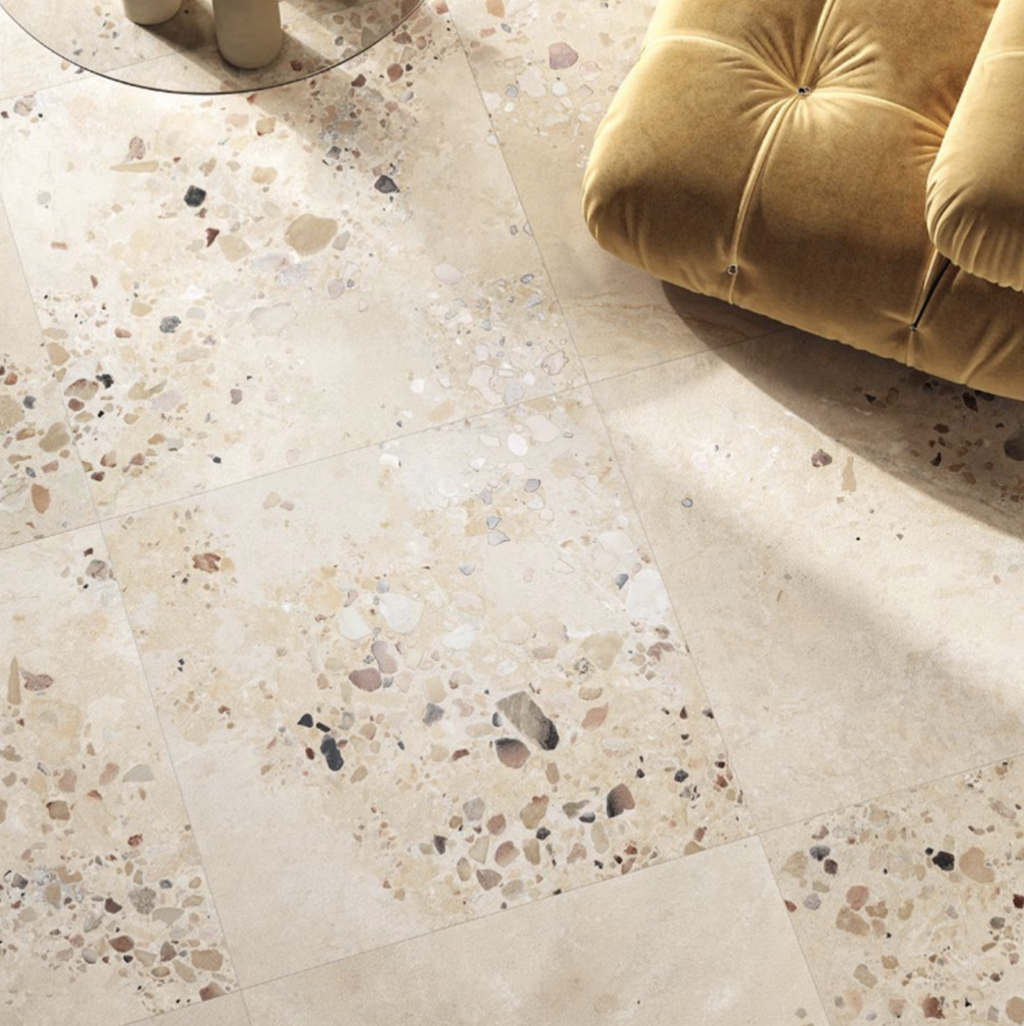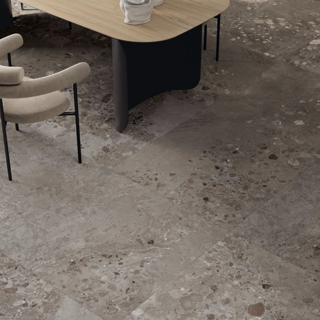 Le carrelage Materia Pura rend hommage aux pierres naturelles de Sicile, caractérisées par leur composition de galets et de fragments minéraux. Cette esthétique terrazzo, volontairement irrégulière, génère une surface vivante et harmonieuse. Grâce à la technologie avancée de reproduction graphique, chaque dalle révèle une variation aléatoire qui évite toute monotonie visuelle.