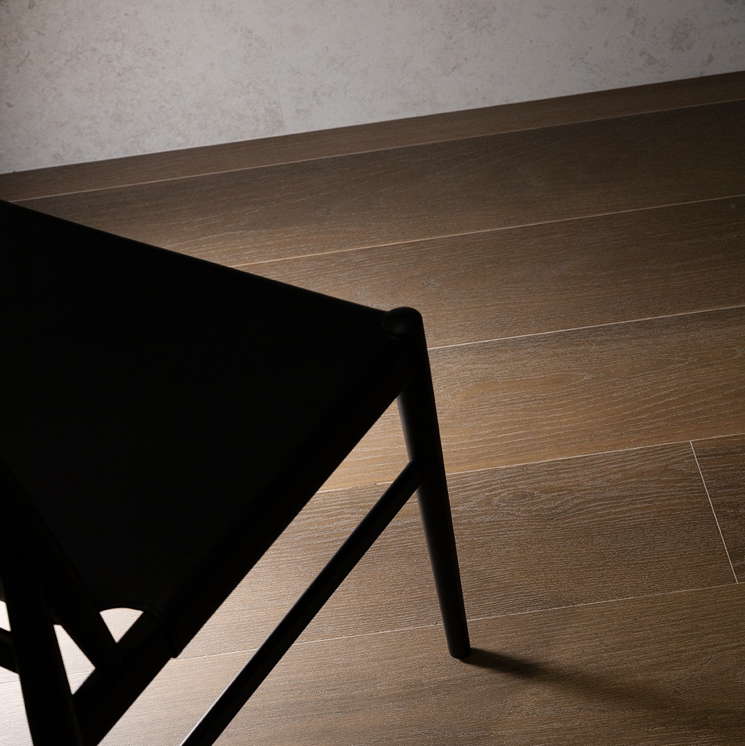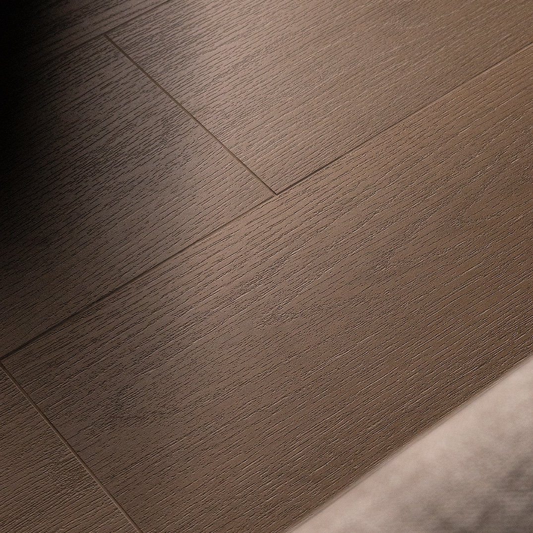 Pura Aria se distingue par un rendu bois délicat, sans excès de nœuds ni contraste abrupt. Le carrelage décline des veines fines et harmonieuses, inspirées du chêne brossé. Cette subtilité crée des espaces calmes, accueillants et lumineux, parfaitement adaptés aux intérieurs contemporains. Les teintes Light ou Sand favorisent les ambiances douces et naturelles, tandis que Canella, Cognac et Walnut apportent profondeur et caractère.