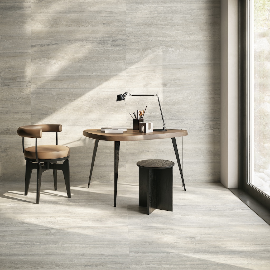 Ce carrelage prouve que la noblesse du travertin peut être revisitée de façon moderne et fonctionnelle, tout en conservant son pouvoir évocateur.