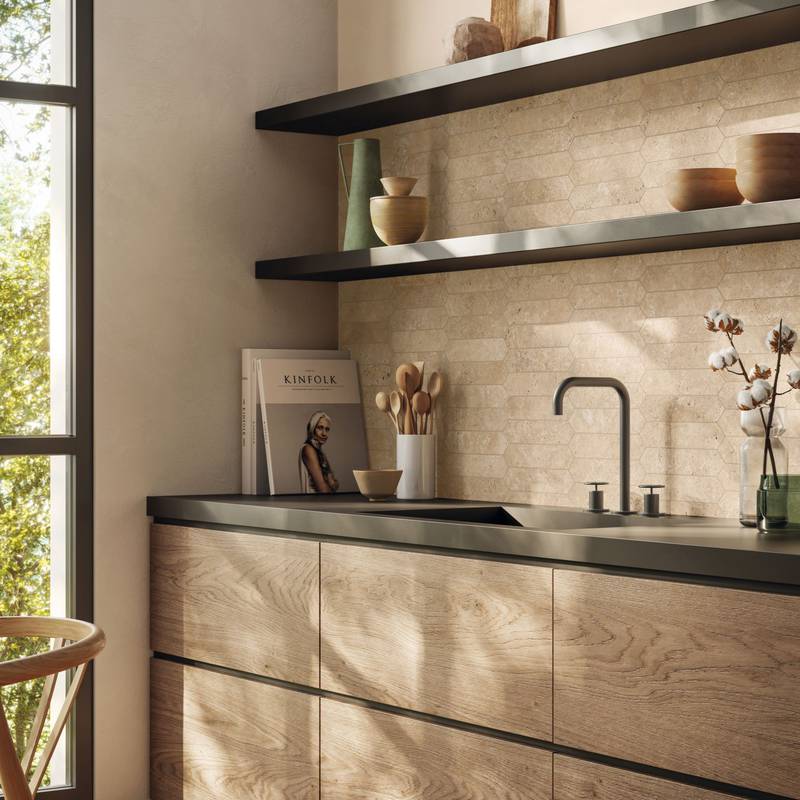 Un carrelage effet travertin à l’élégance minérale, pensé pour des espaces sobres et intemporels.