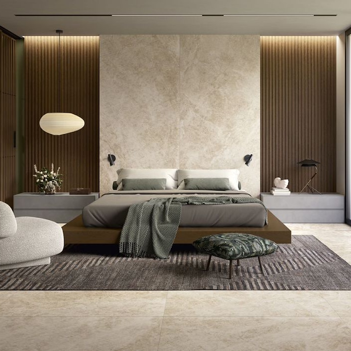 Les finitions disponibles incluent le poli miroir pour un effet luxueux, le mat naturel pour un rendu contemporain et la finition douce Touch pour les espaces de bien-être. Chaque format et finition permet au carrelage de s’adapter à des usages variés, du résidentiel au professionnel.