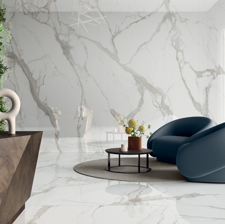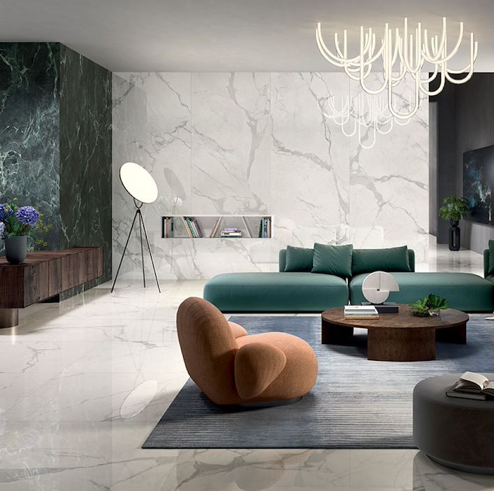 Les couleurs lumineuses comme Statuario Supreme ou Crystal White créent des pièces aériennes. Les teintes plus profondes comme Gray Marble ou Viola Arabesque apportent un style plus affirmé. Grâce à sa finition mate ou polie selon modèle, ce carrelage s’intègre dans tous types de projets haut de gamme.