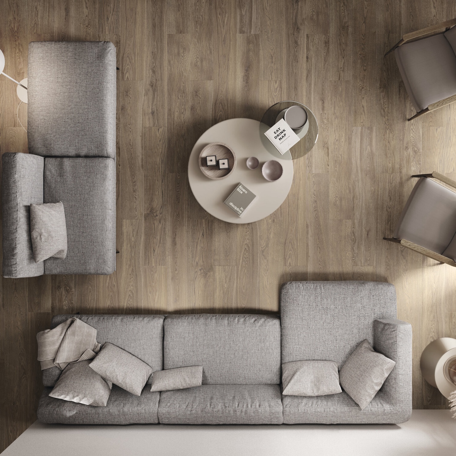 Le carrelage Wild Essence transpose la noblesse du bois en un matériau céramique performant. Inspiré d’essences de chêne aux nuances sombres, il offre un rendu proche du parquet huilé, avec des détails subtils qui restituent le charme du bois naturel. Chaque dalle présente des variations graphiques modérées qui accentuent l’authenticité du matériau.